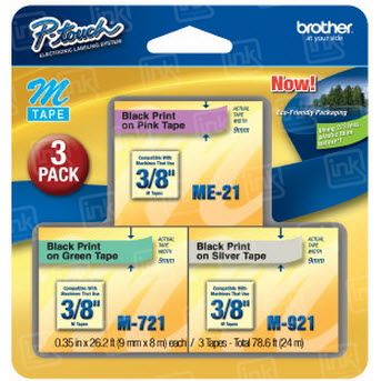 Brother brand ME793 black on pink, silver and green tape cartridges are high quality tape cartridges designed exclusively for your P-Touch printer. Each ME793 tape cartridge is (1 Each) 9mm (0.35"") and non-laminated. The three pack includes one cartridge each of black on pink, black on green and black on silver tape You can order your ME793 tape cartridge right here, no hassle, no delays. 100% Satisfaction Guarantee.